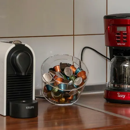 Крім кавоварки, гості, які зупиняються в апартаментах, можуть користуватися обладнаною кухнею, укомплектованою електрочайником, холодильником і духовкою.